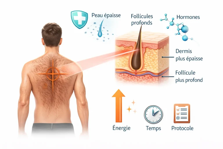 Le dos masculin cumule trois contraintes biologiques qui en font la zone la plus technique à traiter par épilation laser: une peau épaisse, des follicules profonds, et une pilosité influencée par les hormones.