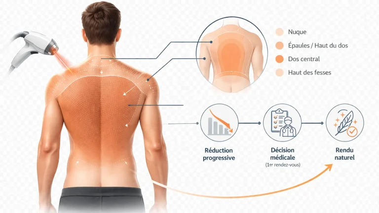 C’est une question que beaucoup d’hommes se posent sans l’écrire franchement. La réponse est simple : non, ça ne se voit pas. La réduction de densité est progressive sur plusieurs mois. L’entourage perçoit un dos plus net, pas une transformation brutale du jour au lendemain. Et pour ceux qui partent d’une pilosité très dense, le médecin peut travailler sur une réduction partielle plutôt qu’une élimination totale, pour un résultat naturel qui ne tranche pas avec le reste de la silhouette.
